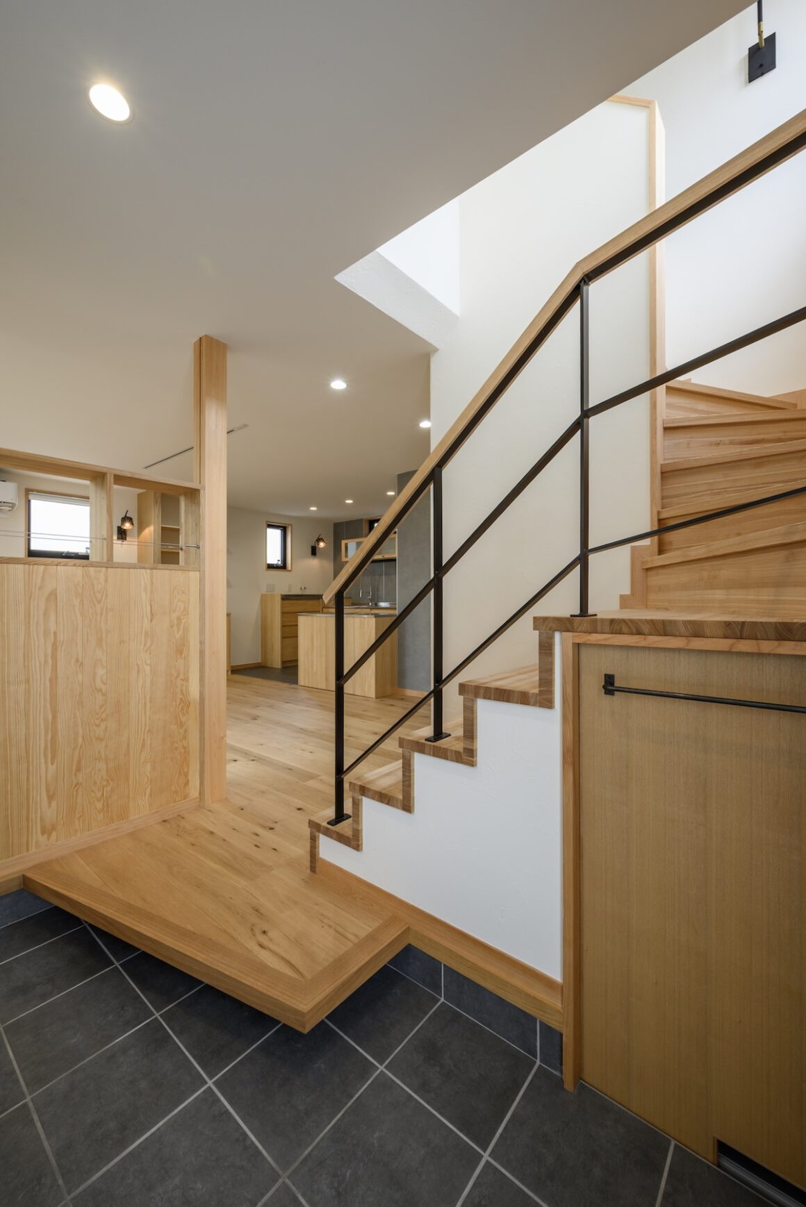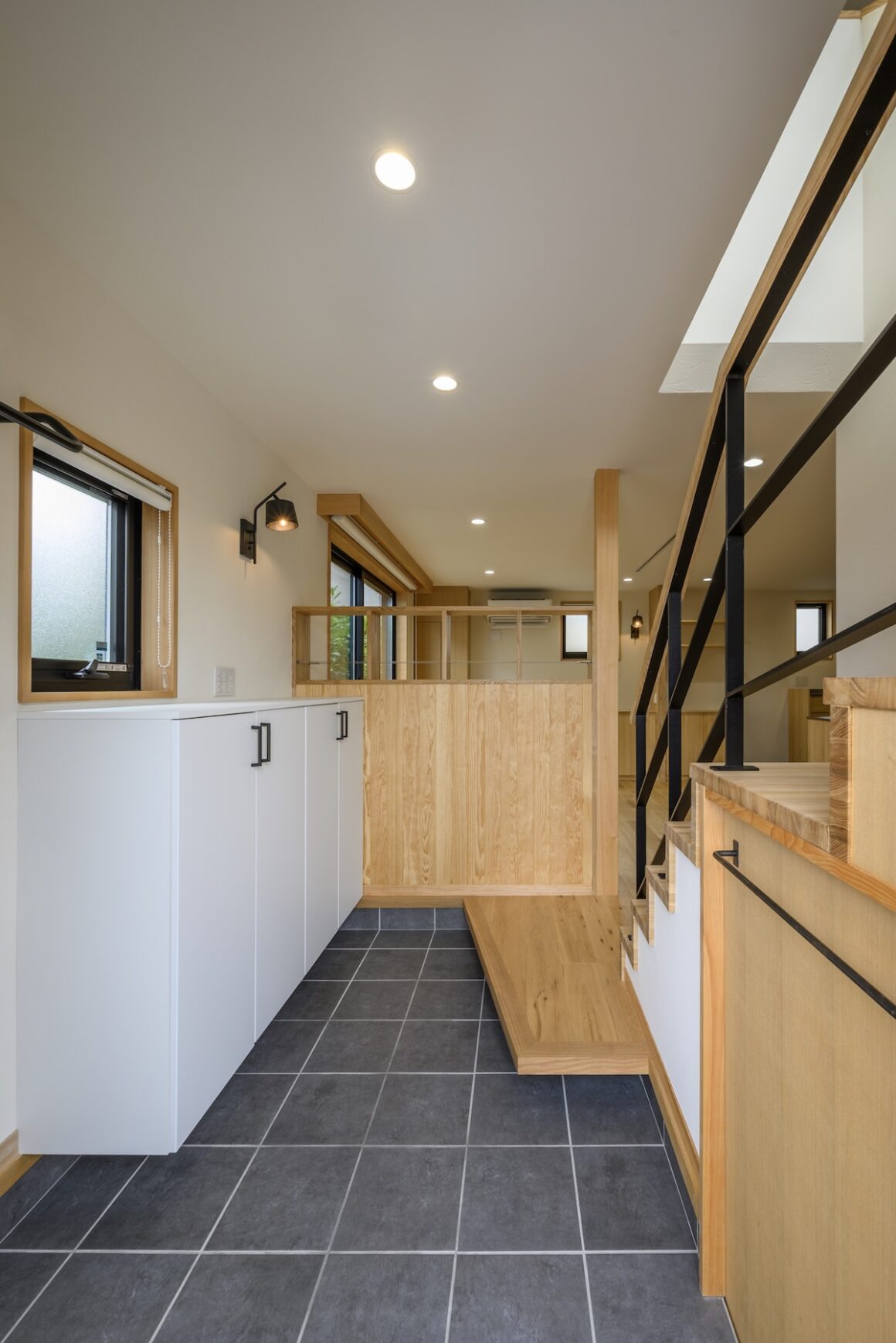 階段の窓から朝日が差し込み明るい玄関は自転車が置ける広さのあるタイルの土間。シンプルで使いやすいシューズクローク、張り出した框(かまち)の下に靴を入れることができいつもすっきりとした玄関を3方向から。