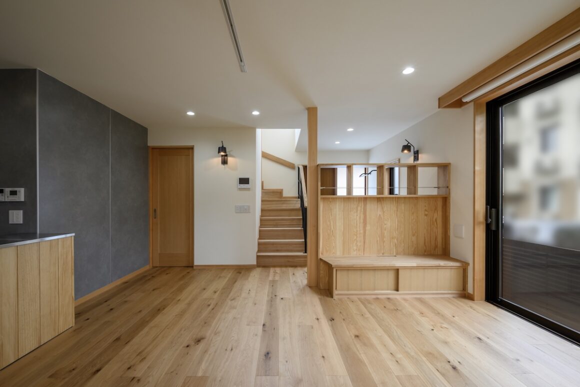 ご家族が長く過ごされる1階リビング、ダイニングではふんだんに無垢材が使われています。とくに床材は小さなお子さまには素足に優しいフローリングを選びました。